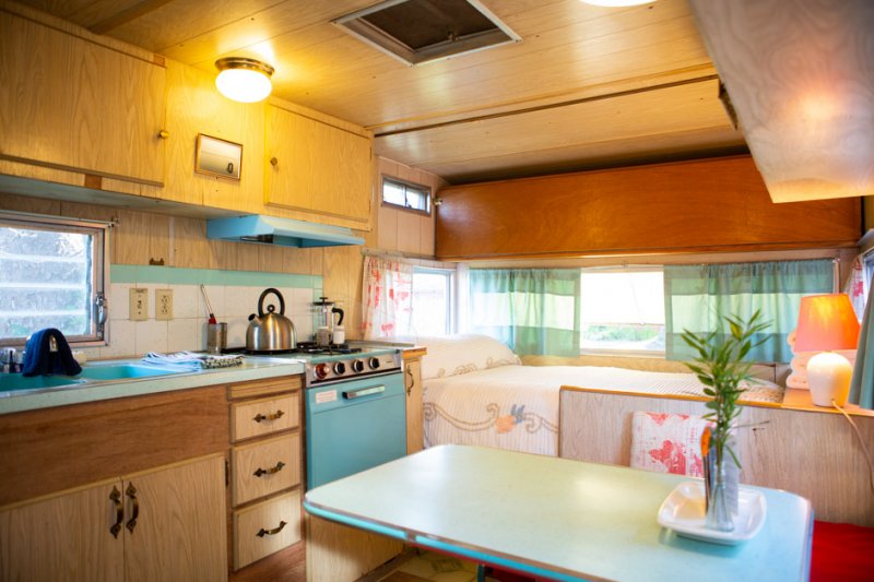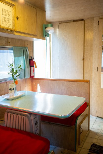 Cozy 1953 Baby trailer with bench‑style booth seating, turquoise vintage sink and stovetop, and soft morning/evening light from east/west windows. In the East trailer court; has private bathroom, shower, and picnic table.