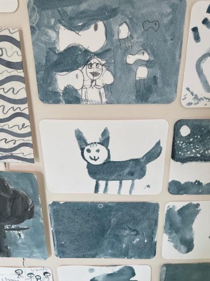 The madder handprint cloth was made during a session of the AWE afterschool art program with children ages 3-10. It references the red ochre hand prints found globally in ancient cave art. These sites most often show the hands of women and children.