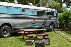 Classic vintage Greyhound bus conversion for families: king bed plus two twin daybeds. Curved birch paneling, handcrafted lighting, custom Juju Papers wallpaper, private bathroom, cooktop, fridge, ¾ tub/shower, record player, picnic table, and fire ring.