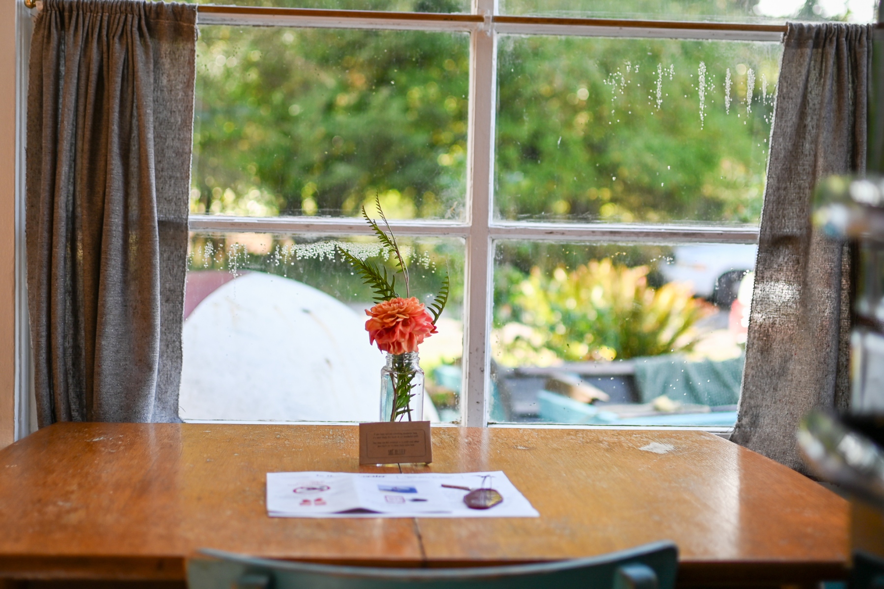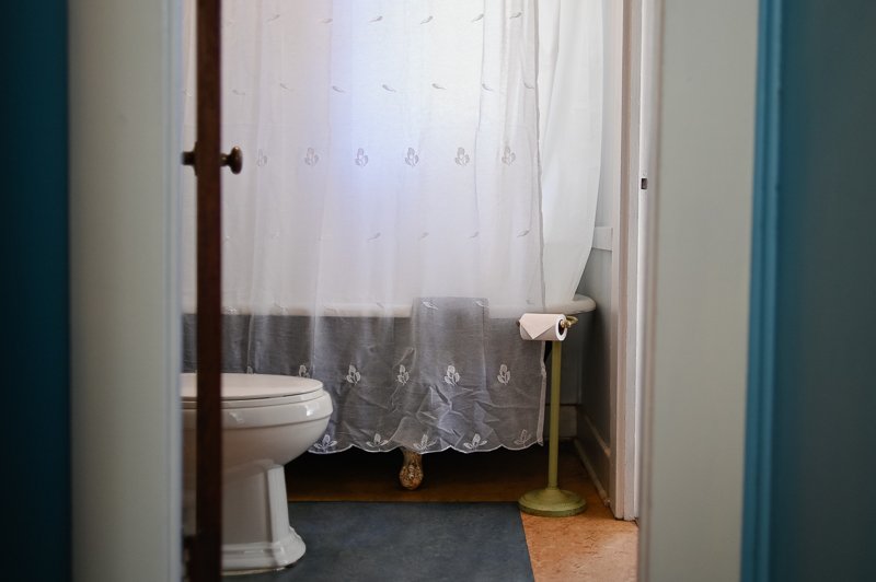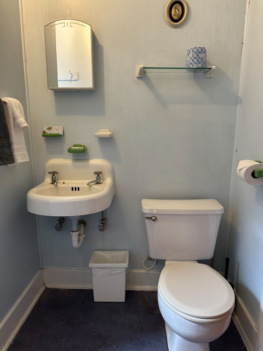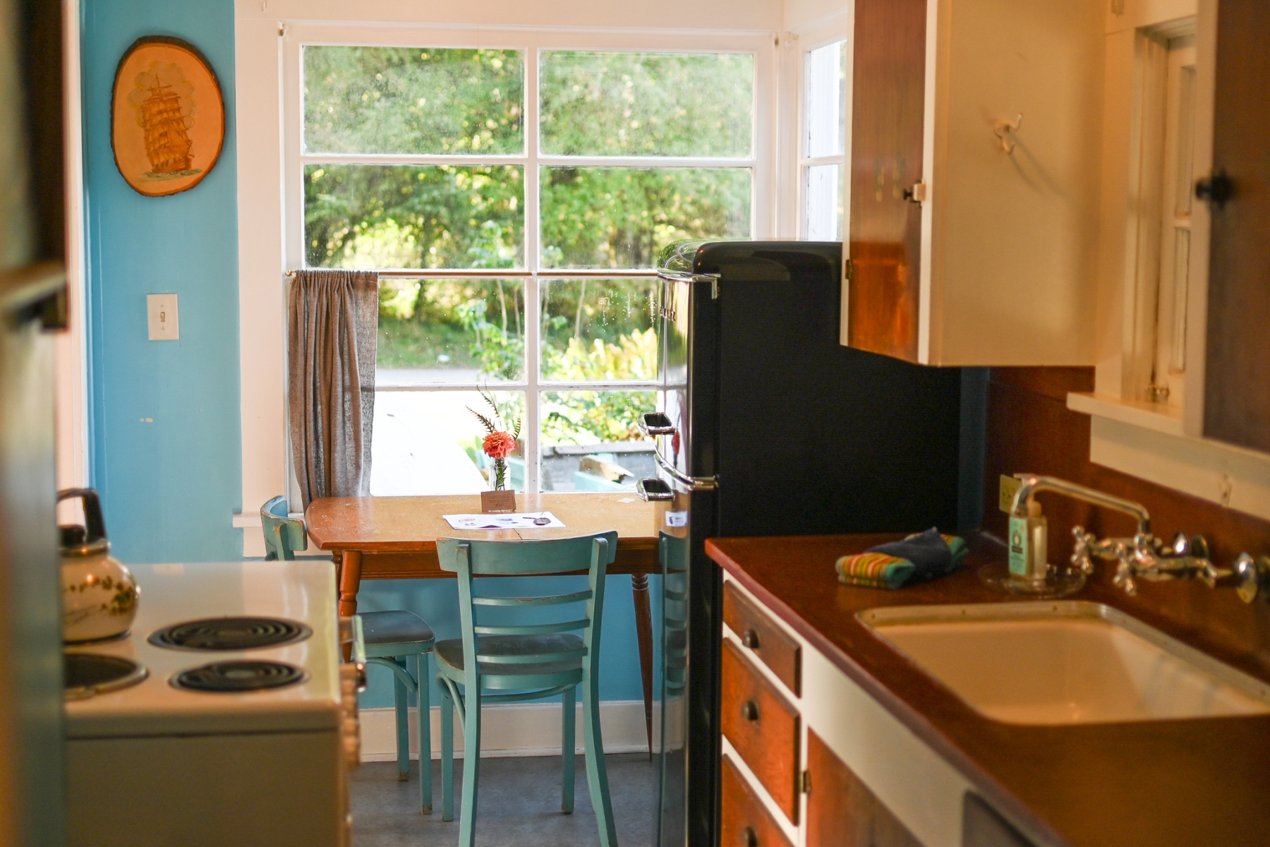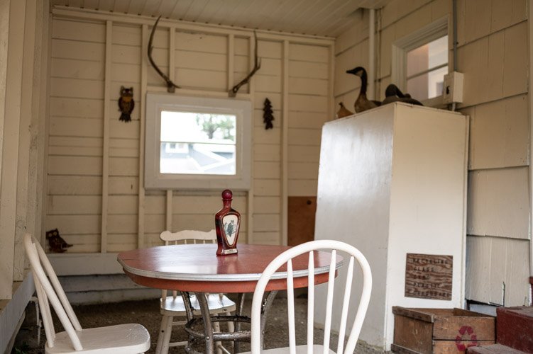 The Forties is a bright, light-filled cabin with vintage decor from the ’40s displayed throughout. This space is set up for a small group or family. There is a queen-sized bed in the bedroom and a full bed in the living space. The circular layout of the cabin means each party can access both the kitchen and the bathroom without having to pass through the bedroom. There is an attached covered carport with seating and table.