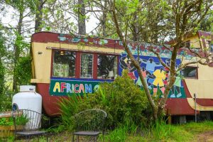Tri‑level 1953 Deluxe Double Decker trailer for up to 6. First floor has two twins, second floor master bedroom with a full bed, third‑floor loft full bed via ladder. Spacious kitchen/dining for gatherings, decorated with vibrant African art; inner trailer court near fire pits.