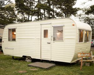 Adorable late‑60s Baby trailer with a spacious seating nook and lots of natural light. In the east‑most trailer court near Buena Vista and Rocket. Includes oven, private bathroom, shower, and picnic table.