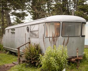 A 1953 Standard/Park Model trailer and original Artist Residency unit. Curved white walls and minimalist aesthetic, west‑facing afternoon light, in the inner trailer court near the main Lodge and fire pits.