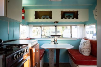 Nestled in the South/Center of our grounds, the 1950s Shasta vintage travel trailer offers a charming retreat for solo travelers. This vintage gem, part of our Rustic collection, provides a cozy sanctuary with essential amenities including water, electricity, and heat. The intimate interior features a compact stovetop for simple meal preparation and original bench-style seating surrounded by windows, perfect for relaxation and taking in the views. Ideal for those who appreciate minimalist living, the Shasta sits at the end of a gravel drive, near the Pavilion, Deer, and Aloha Campers. Guests have access to two heated, private/public bathrooms and showers located in the nearby pavilion. Experience the joy of simple living in this quaint, private pod – a perfect getaway for the solo adventurer seeking a unique and intimate escape.