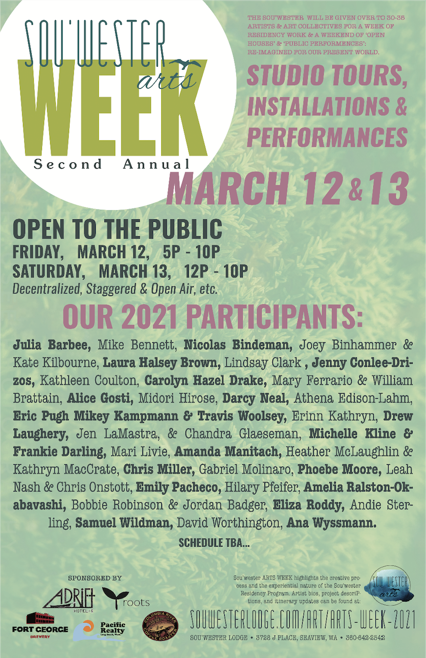 March 7-14, 2021 The Sou’wester hosted 30-35 artists and art collectives for a week of residency work, music, performances and installations.