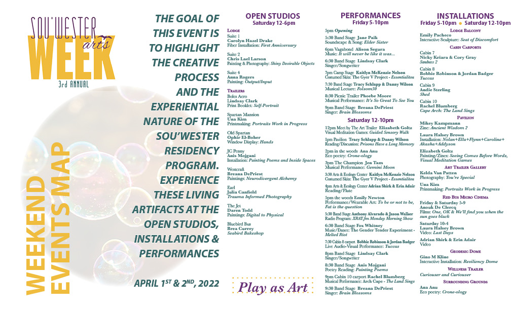 Play, like art-making, grounds us in the process of transforming ourselves and the world around us. An artist takeover of 30+ diverse creators is coming to Sou’wester for a week-long Artist Residency; to play with materials, the environment, and each other. They will come create and transform The Sou’wester into a Studio/Gallery/Theater/Stage. Providing opportunities for extended play on the weekend, we invite the public to witness, interact with, and re-imagine their work through studio tours, installations and performances. Over the past 9 years we have held an event around this time of year to highlight the creative process and the experiential nature of the Sou’wester Residency Program. Each year this event brings amazing artists to this neck of the woods and celebrates the transition from the darkest heart of winter into the renewal of spring.