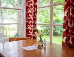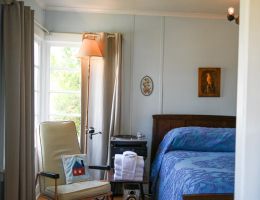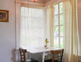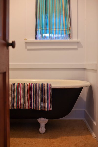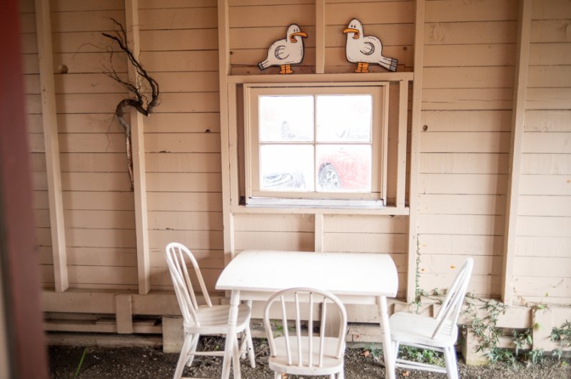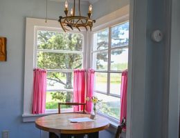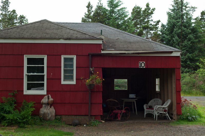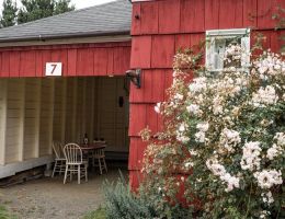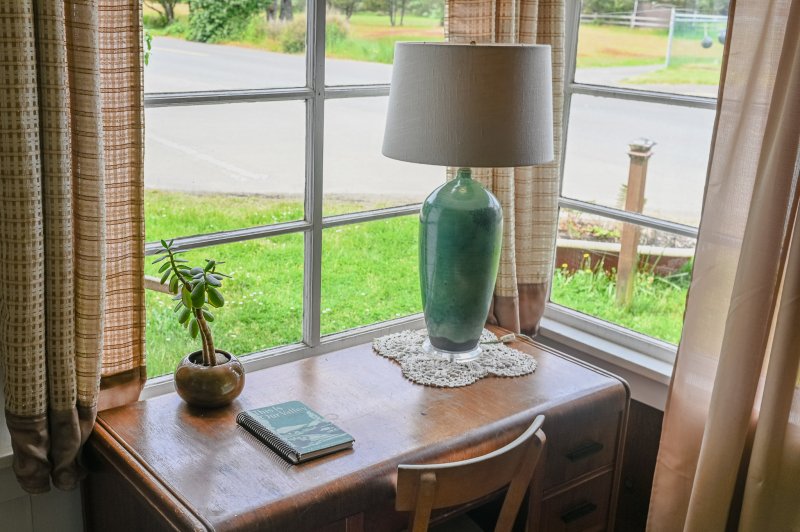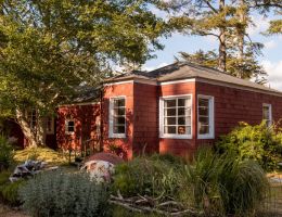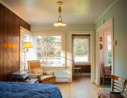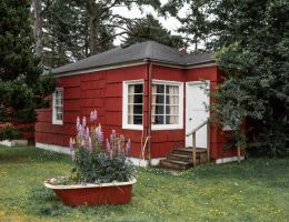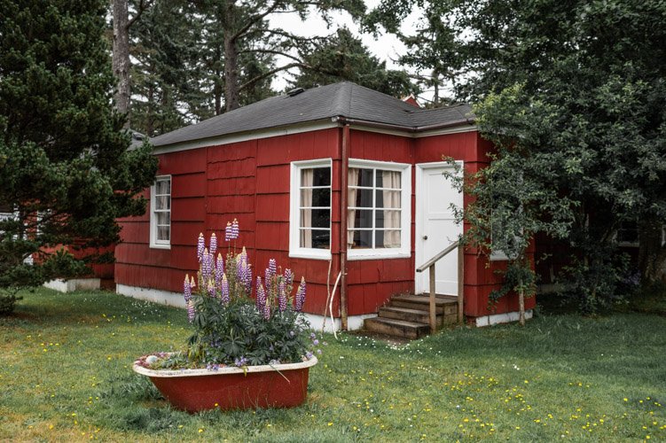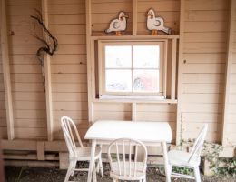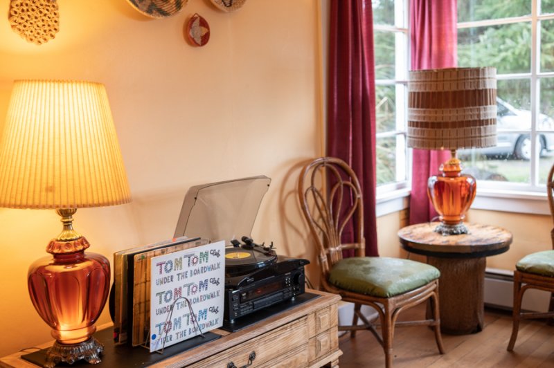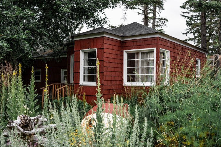 The Beach Cabin accommodates 2 adults and 1 youth. This bright, stand-alone cabin offers views of the coastal forest and is the only one featuring a charming claw-foot tub. Inside, you’ll find a record player, a cozy reading corner, and nautical decor, including whale bones. Additionally, it has an attached covered carport with seating and a table.