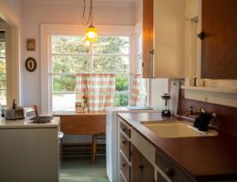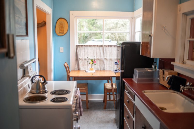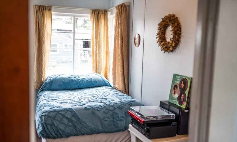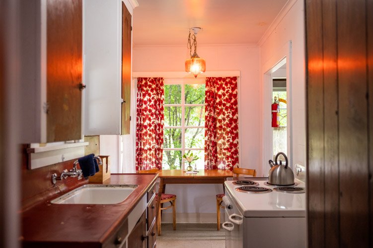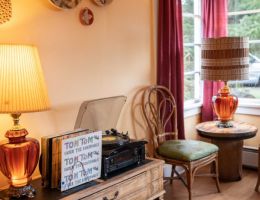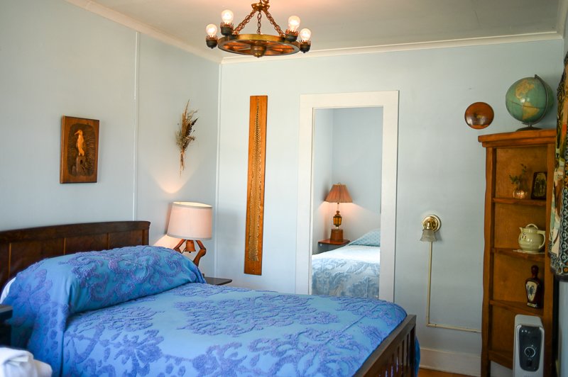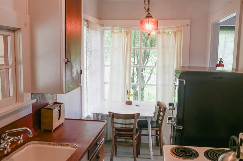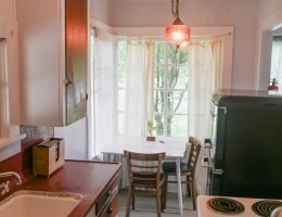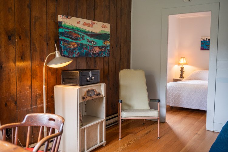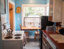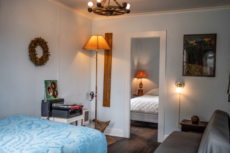 The Forties is a bright, light-filled cabin with vintage decor from the ’40s displayed throughout. This space is set up for a small group or family. There is a queen-sized bed in the bedroom and a full bed in the living space. The circular layout of the cabin means each party can access both the kitchen and the bathroom without having to pass through the bedroom. There is an attached covered carport with seating and table.