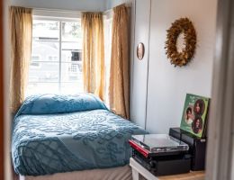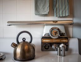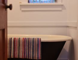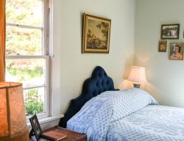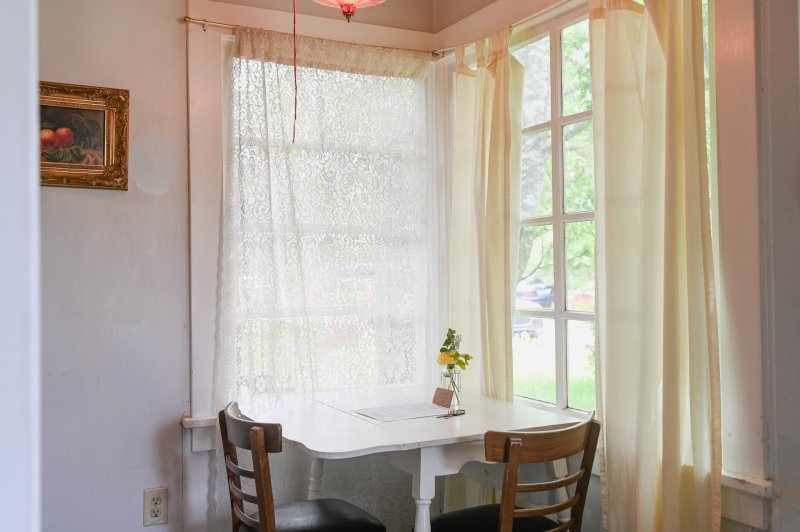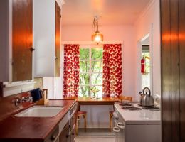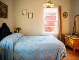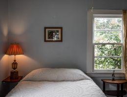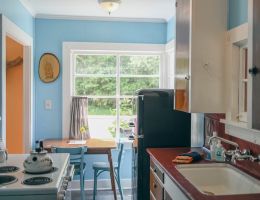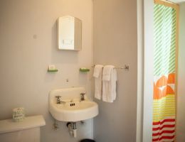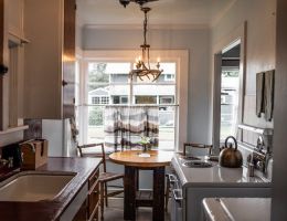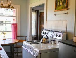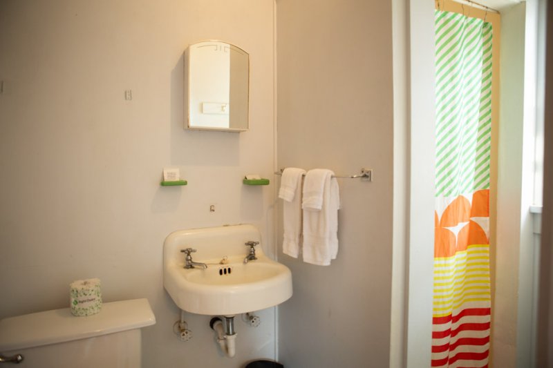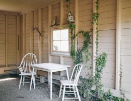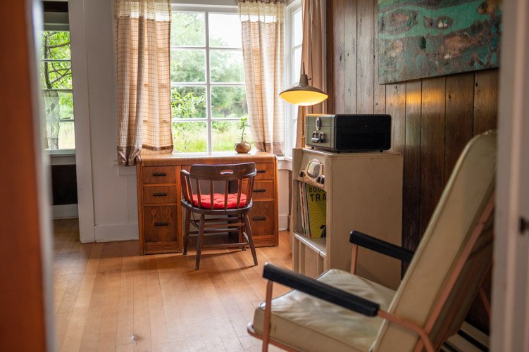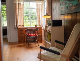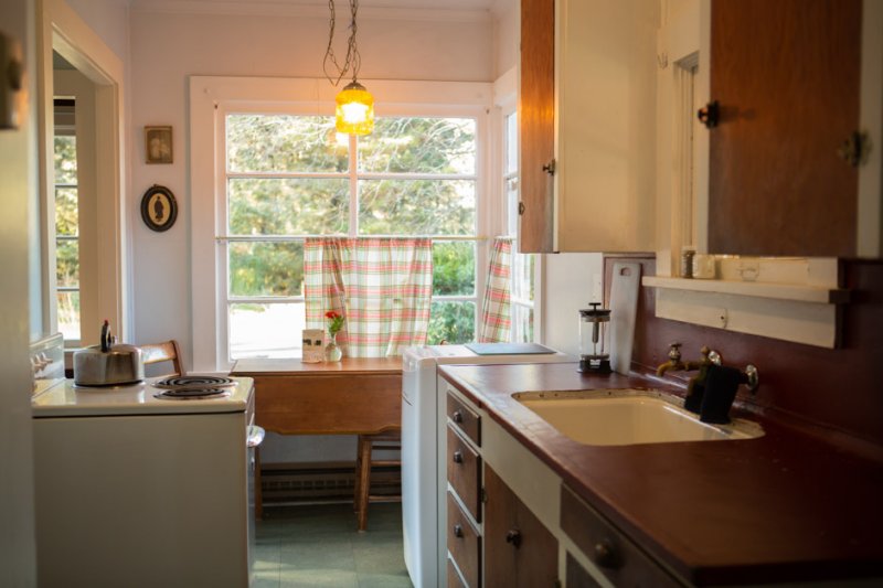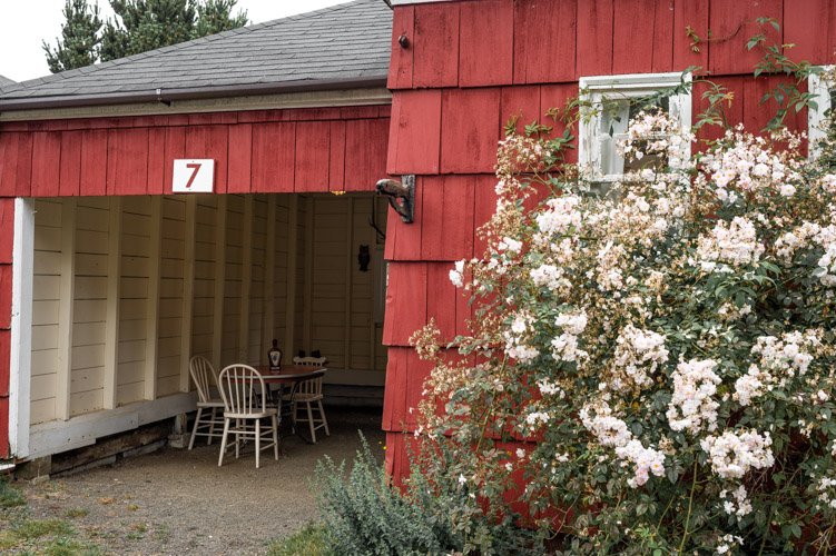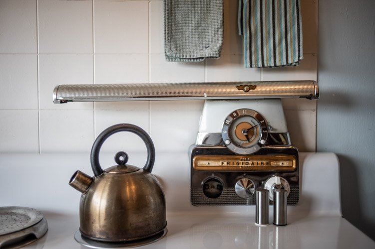The Forties is a bright, light-filled cabin with vintage decor from the ’40s displayed throughout. This space is set up for a small group or family. There is a queen-sized bed in the bedroom and a full bed in the living space. The circular layout of the cabin means each party can access both the kitchen and the bathroom without having to pass through the bedroom. There is an attached covered carport with seating and table.