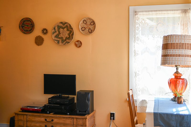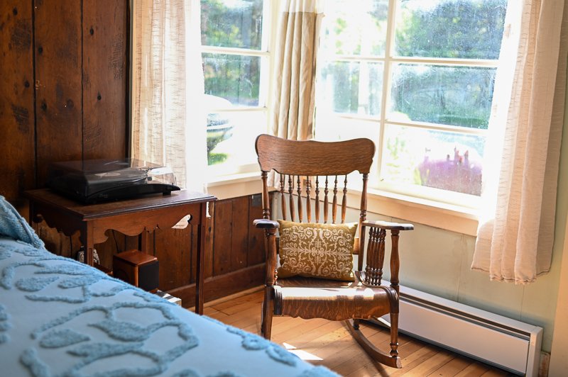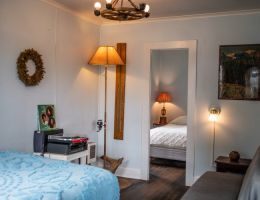 The Woodsman is a rustic-style cabin with dark hardwood floors, woodland decor, and a record player with speakers. There is a queen-sized bed in the bedroom and a full bed in the living space. It is great for family or friends who are sharing the space. With north and south-facing windows, the cabin is filled with soft, filtered natural light and has an attached covered carport with seating and a table.