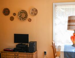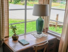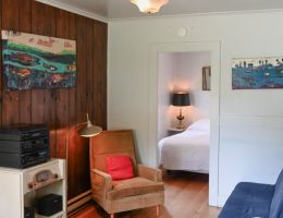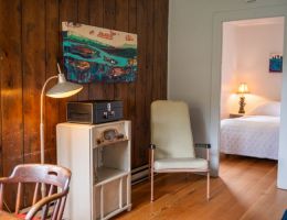 Paradise Point sleeps 2 adults + 1 youth. This cabin is a bright and spacious with a full living room that features a desk, reading chair, and record player. As a corner unit, it benefits from ample natural light and has an attached covered carport with seating and table. Perfect for romantic weekends.