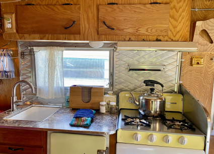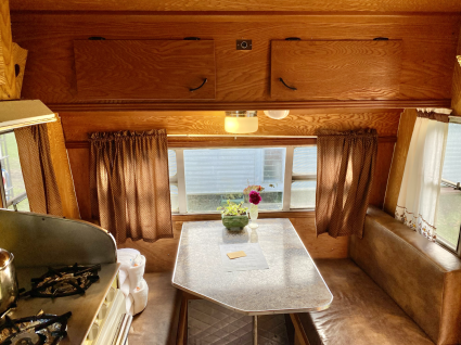 The Westerner is a 14-foot, 1950s vintage travel trailer time capsule designed for a solo retreat. Rich wood and antique charm fill this little trailer, which includes booth-style seating and a comfortable twin bed. You’ll find all the essentials—a stove, ice box, water, and heat—making it ideal for experiencing the joys of tiny living. Situated in our Eastern trailer court next to the Fireball trailer, The Westerner also offers full access to two heated, private/public bathrooms and showers in the nearby pavilion. Perfectly nestled by woods and sea, it’s a haven for those seeking a snug, nostalgic getaway.